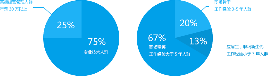 英才網(wǎng)聯(lián)的專業(yè)人才庫(kù)中專業(yè)技術(shù)人群占比頗高,可見(jiàn)專業(yè)技術(shù)人群非常雄厚、充足。同時(shí),對(duì)于企業(yè)客戶來(lái)講,應(yīng)屆生、職場(chǎng)新生代、職場(chǎng)骨干、職場(chǎng)精英等人群可謂應(yīng)有盡有,足夠滿足企業(yè)的日常招聘、專業(yè)崗位的招聘等需求。